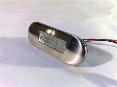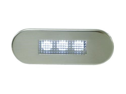 Luce di cortesia stagna in policarbonato, con frontalino in acciaio inox lucido. Funzionamento con 3 led tipo "long life". 12 v.
