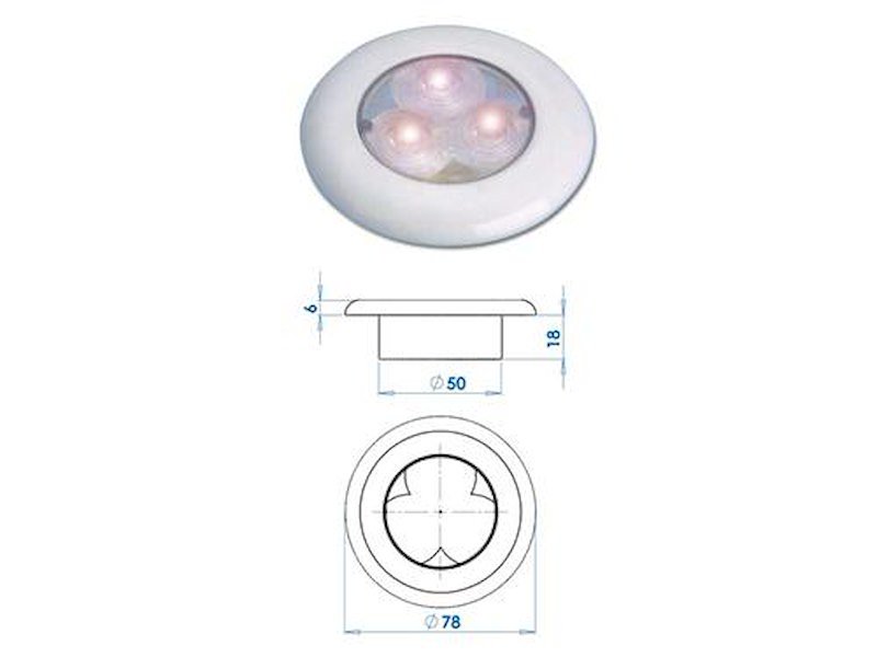 12 volt . Cornice in ABS bianco. Può essere fissata sia ad incasso o esterna, grazie ad una cornice fornita come accessorio. Dimensioni esterno 78 mm, incasso 48 mm.