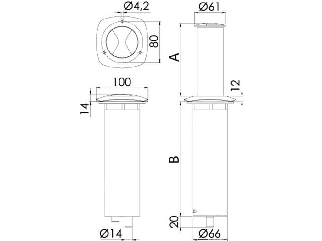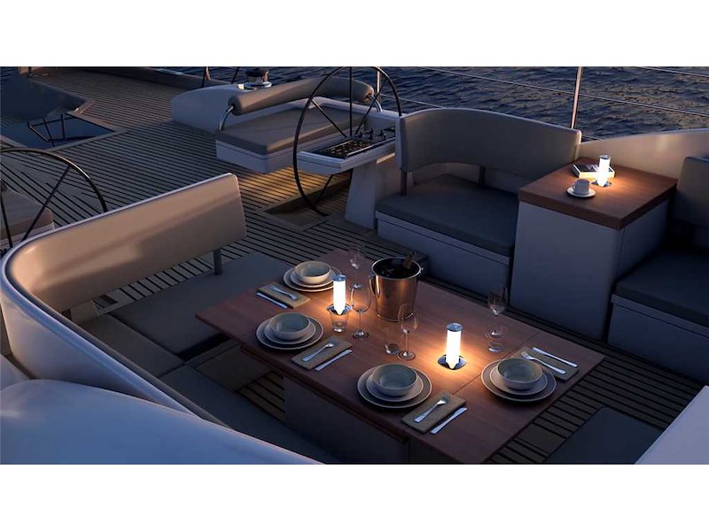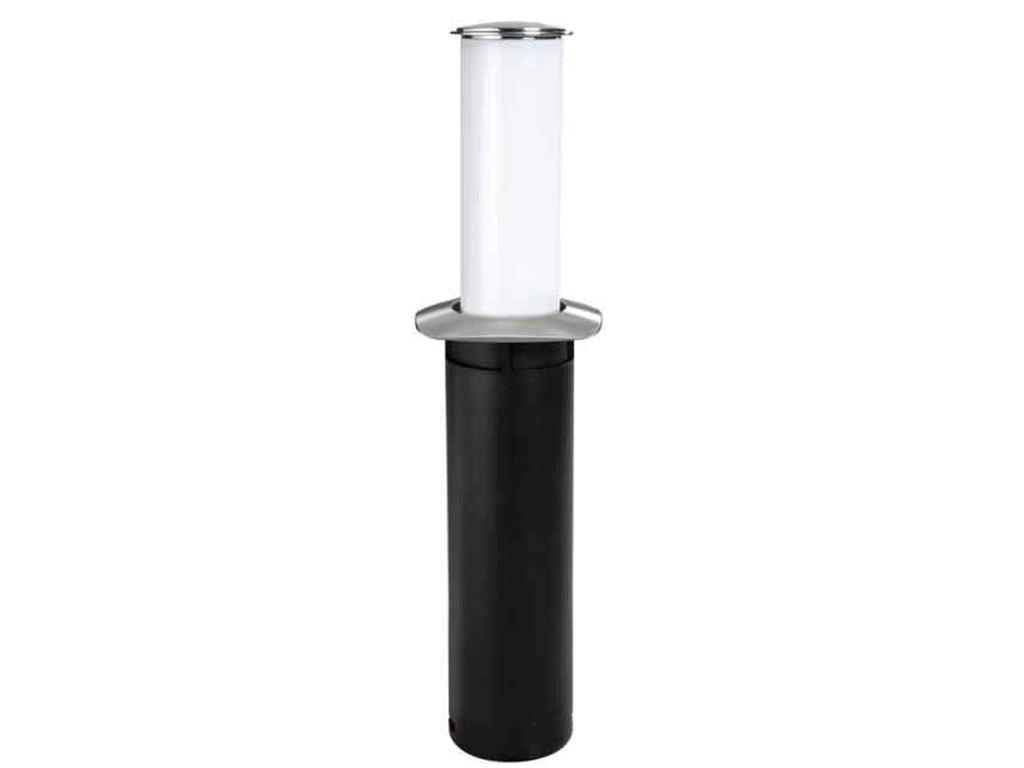 Da spenta la luce rimane a filo piano del tavolo e con una leggera rotazione del piattello inox superiore si alza accendendosi automaticamente.