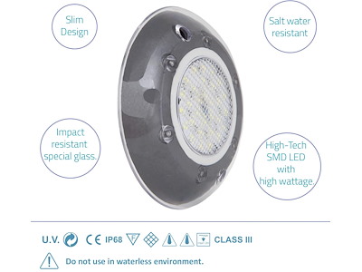 - Grado di protezione IP68: completamente impermeabile e adatto per un’immersione prolungata, resistente all’acqua salata e/o trattata con cloro.