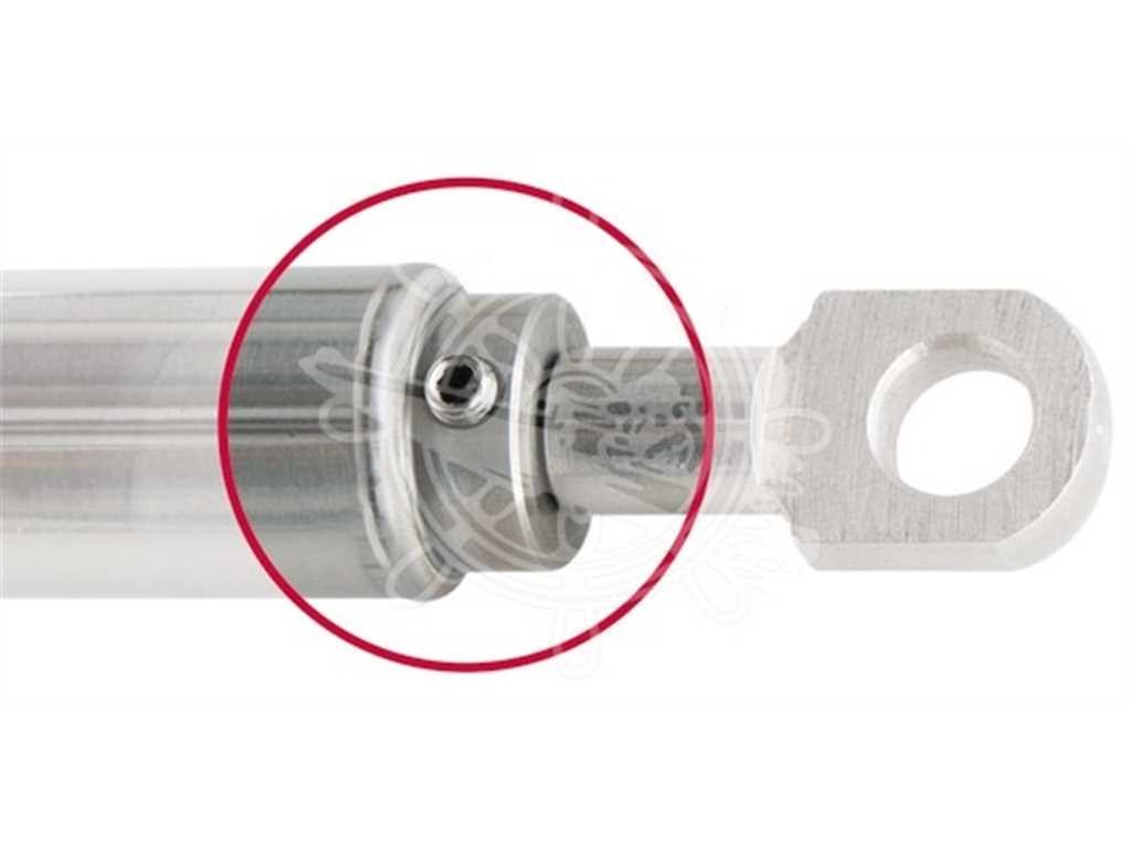 Provvista di valvola di sfiato che permette all’utente, partendo da una carica di reazione elevata, di ridurre il carico fino alla pressione desiderata adattandola al peso del portello/gavone. La taratura funziona solo in scarica. Completa di terminali ad occhiello in acciaio inox, foro Ø 8 mm e chiave per la valvola di sfiato.