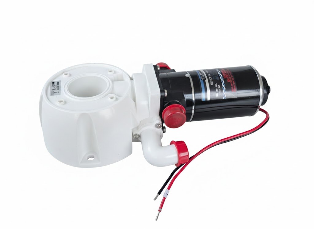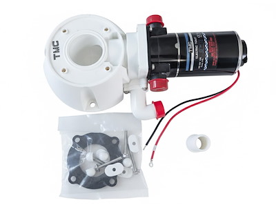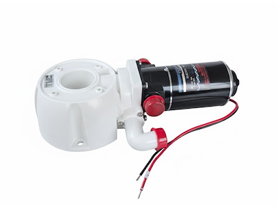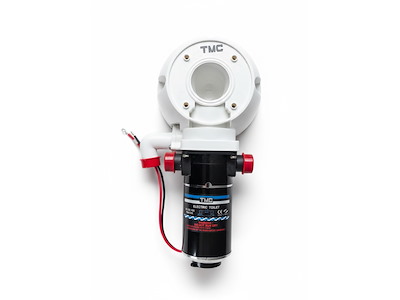 Motore con basamento di ricambio per wc elettrici TMC. Completo di viti e guarnizione. Elica maceratore in acciaio inox. Tubo ingresso ed uscita da 25 mm.
