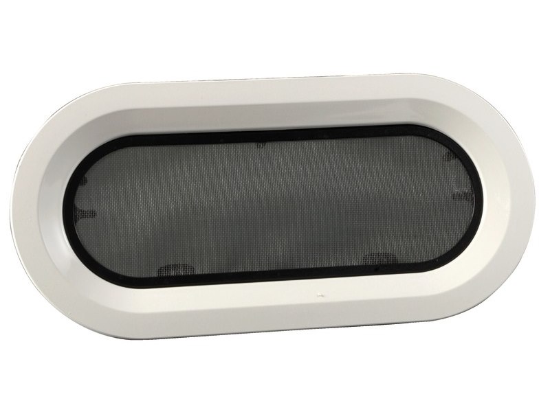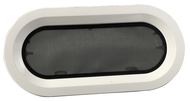 Oblò di qualità Bomar modello Flagship apribile. Forma Ovale . Carcassa in nylon con ghiera esterna di finitura e zanzariera. Fermi regolabili. Vetro acrilico fumè. Fissaggio con viti invisibili. Adatto per spessore murata da 6 a 35 mm. Colore bianco. Omologato CE.