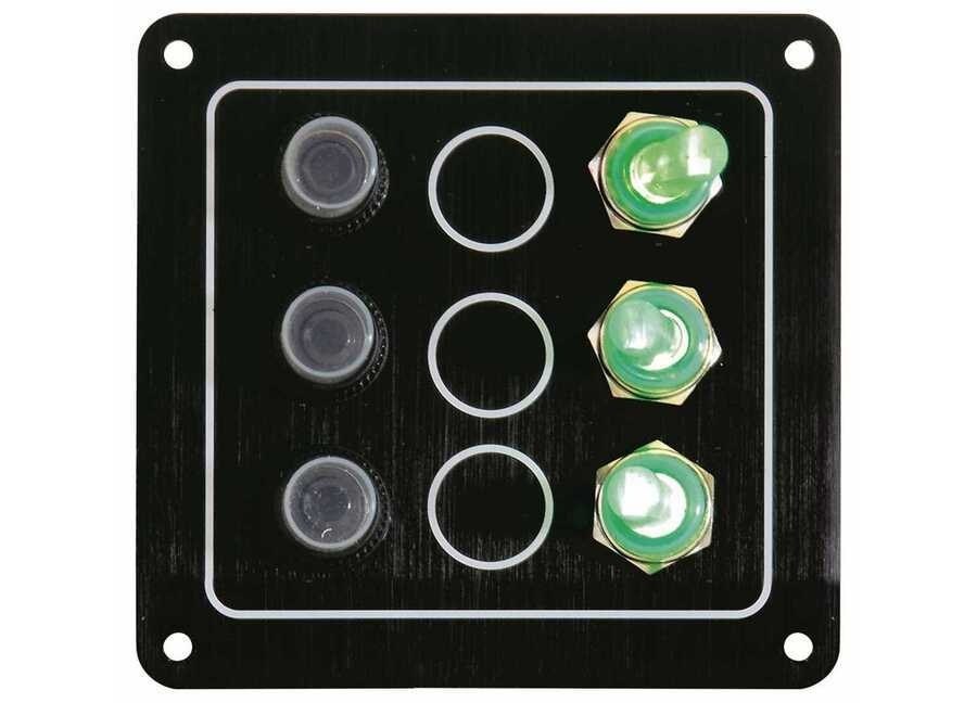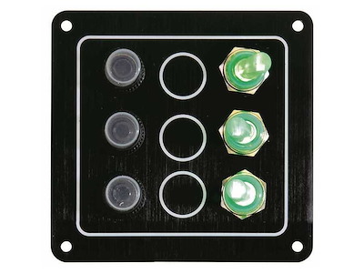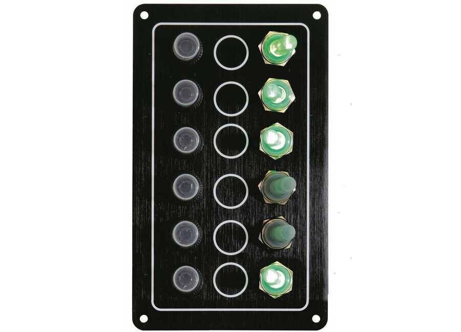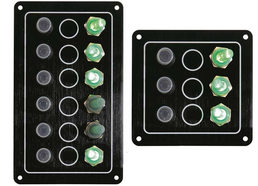 Pannello di comando a 12V compatto e professionale, progettato per installazioni nautiche dove sono richieste resistenza all’acqua, sicurezza elettrica e massima affidabilità. Struttura in alluminio anodizzato nero anticorrosione, ideale per console e quadri elettrici di barche e gommoni.