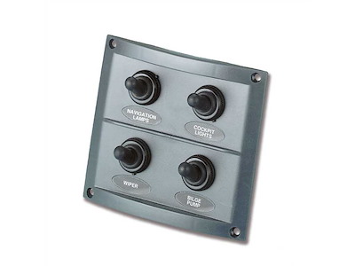 Pannelli elettrici stagni modello "Pilot". Resistenti ai raggi UV, cappucci in neoprene, fusibili in linea dietro il pannello. Completi di simboli adesivi.