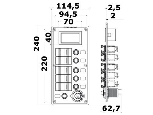 1 Interruttore con funzione ON-OFF-ON + 3 Interruttori con funzione ON-OFF ed 1 interruttore con funzione (ON)-OFF con ritorno automatico, ideale per trombe + Presa accendisigari. Fusibili riarmabili da : 1x5A + 2x10A +2x15A. Dimensioni: 240 x 115 mm. .