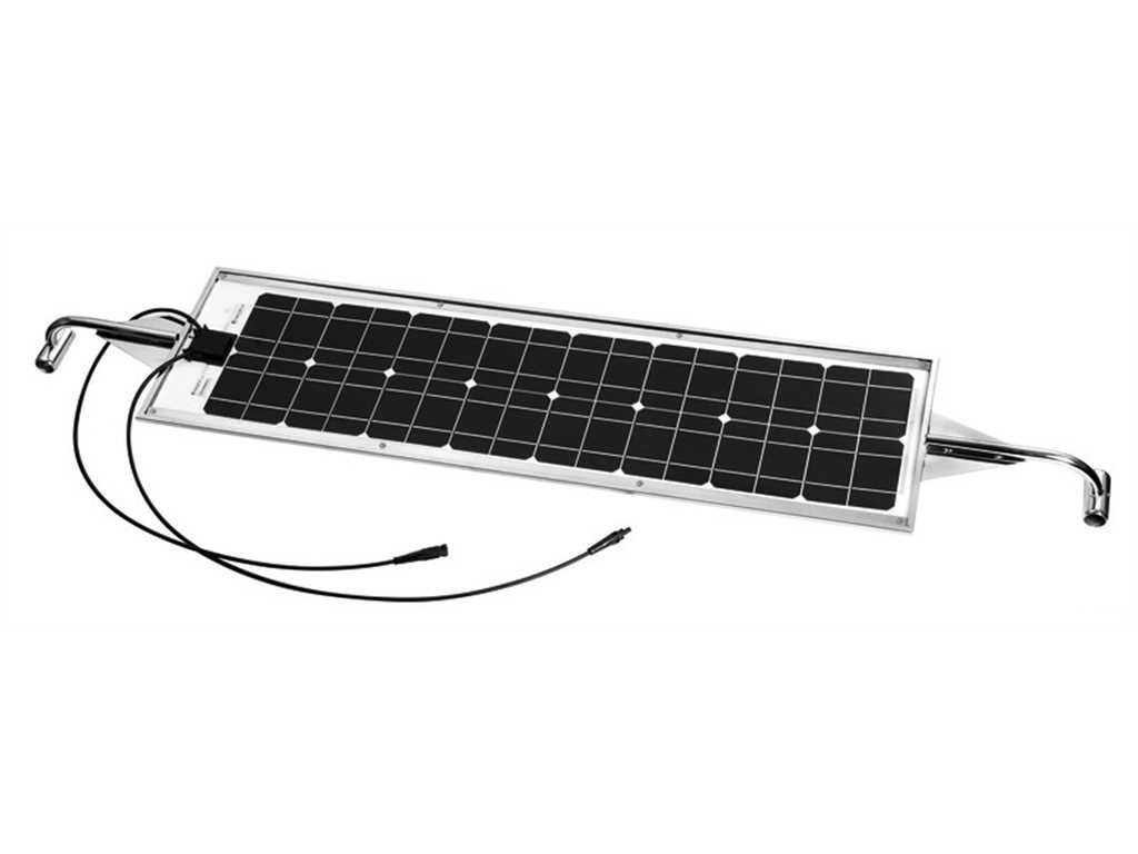 Dotato di terminali adattabili a larghezze 1200-1500 mm. Può essere accoppiato con qualsiasi T-Top in commercio fabbricato con tubi Ø 28/44 mm. Ingombro telaio pannello 1150x320 mm. Completo di 5 m di cavo elettrico solare, due connettori e regolatore di carica.