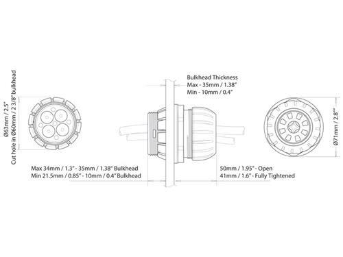Passa paratia in plastica stagno per grandi cavi. Dimensioni: Ø 71 mm. .