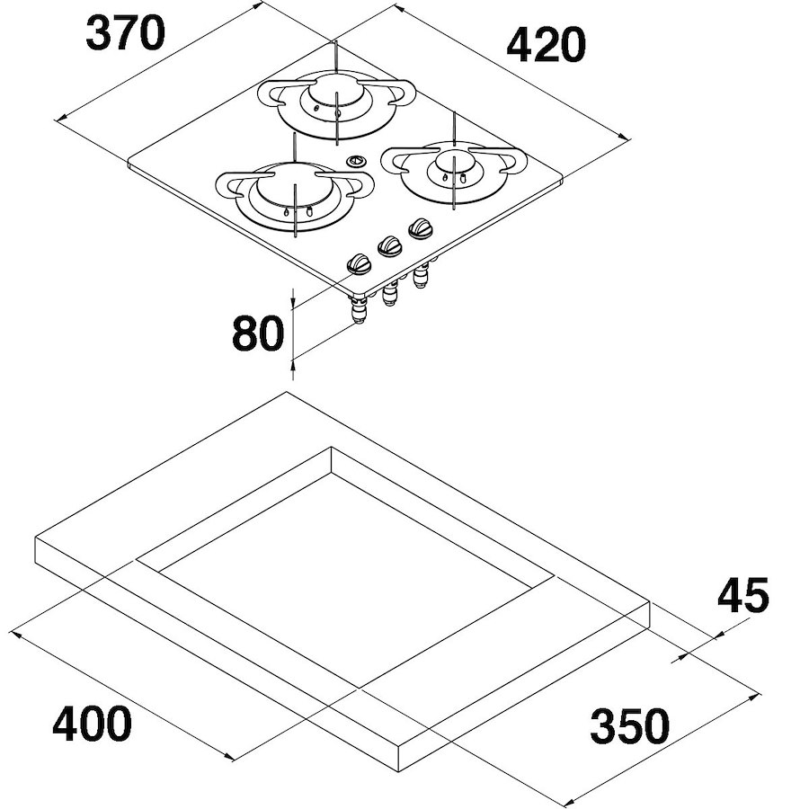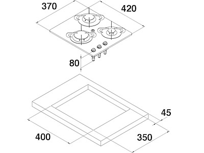 Piano a gas 3 fuochi - 420 x 370 mm -