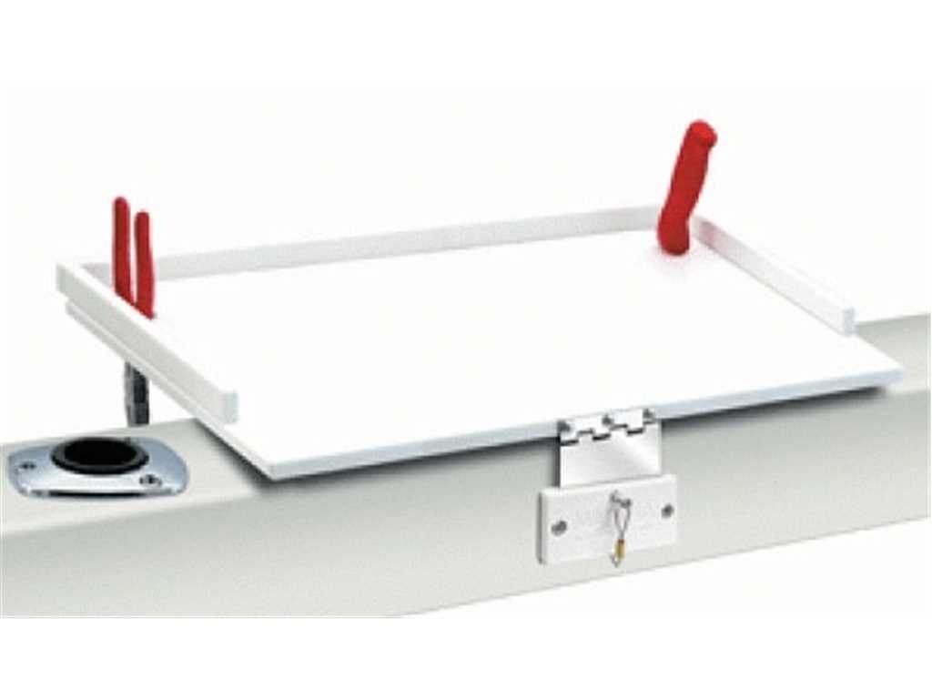 Piano di lavoro in plastica FDA (polietilene HD). Utile per tagliare il pesce o la carne. Il materiale con cui è fabbricato é inodore, infrangibile, resistente UV e non assorbe l’odore dei cibi su di esso lavorati. E' fornito completo di cerniere in acciaio inox sfilabili a baionetta, per poterlo installare o togliere in pochi istanti dal trincarino. Completo di porta utensili.