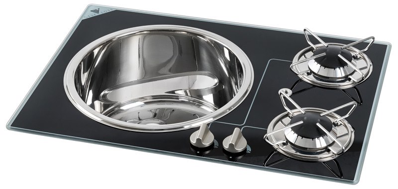 Piano di cottura a 2 fuochi in vetro temperato con Lavello in Acciaio Inox 18/8. Completo di termosicurezze. 2 bruciatori da 1750 watt.