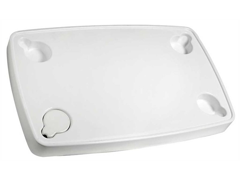Provvisto di due alloggiamenti per tazze, bicchieri, bottiglie che, con appositi tappi in dotazione al tavolo. Possono essere livellati per avere una superficie perfettamente liscia. Adatto al montaggio su basi tavoli scomponibili. Misure c.a. 81 x 51 cm. .