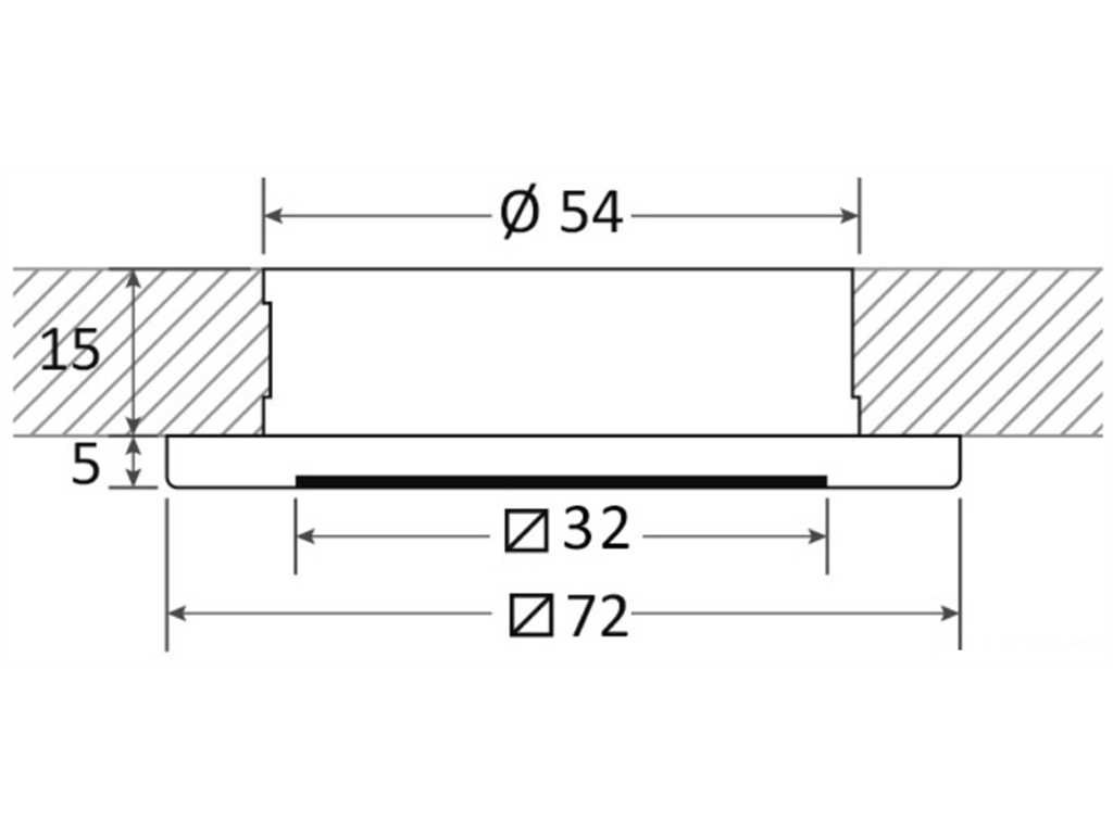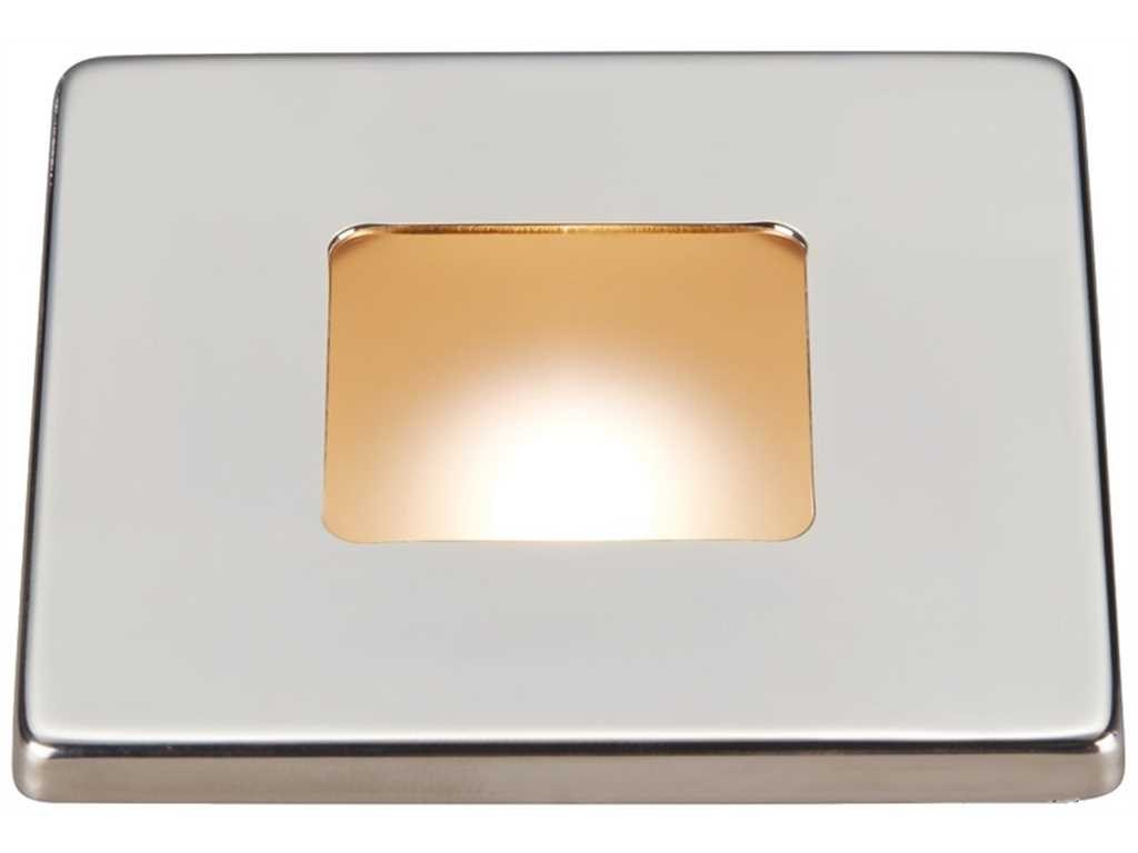 Quadrata con lente rotonda. Carcassa in policarbonato con ghiera in acciaio inox lucidato a specchio. Lente satinata. Un solo LED centrale. Fissaggio con viti.