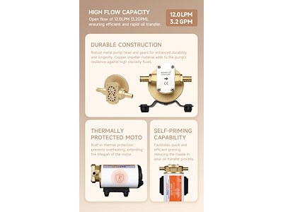Garantisce una portata a flusso libero di 12,0 Lt/min, assicurando un trasferimento rapido ed efficiente dei fluidi. La costruzione è particolarmente resistente: testa pompa e ingranaggi sono interamente in metallo per maggiore durata e affidabilità. L’elica in rame aumenta la resistenza all’usura e migliora le prestazioni con liquidi ad alta viscosità.