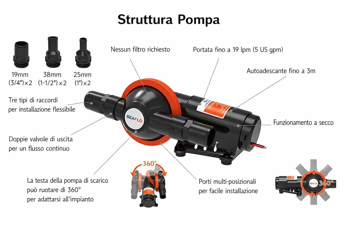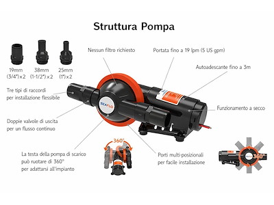 Soluzione ideale per chi necessita di una pompa di scarico compatta, potente e versatile per impianti nautici dove affidabilità e flessibilità di installazione sono essenziali.