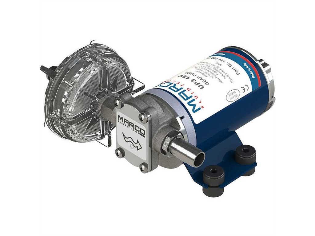 Ellettropompa autoadescante Marco UP3 con ingranaggi in bronzo per travaso liquidi di varia natura, completa di filtro in linea. Corpo in ottone, albero in acciaio inox. Bocche con raccordi in ottone per tubo Ø 14 mm interno. Applicazioni principali: trasferimento gasolio, antigelo, per sentina e acqua di mare. Made in Italy .