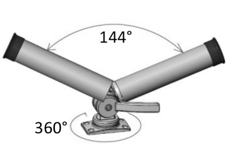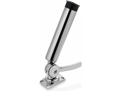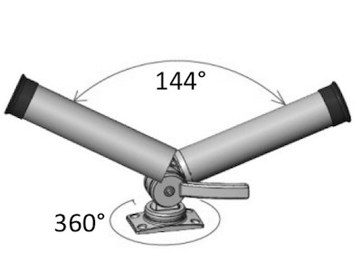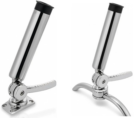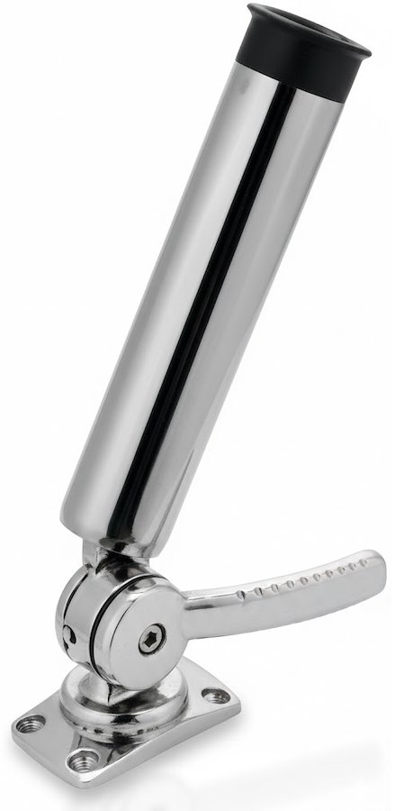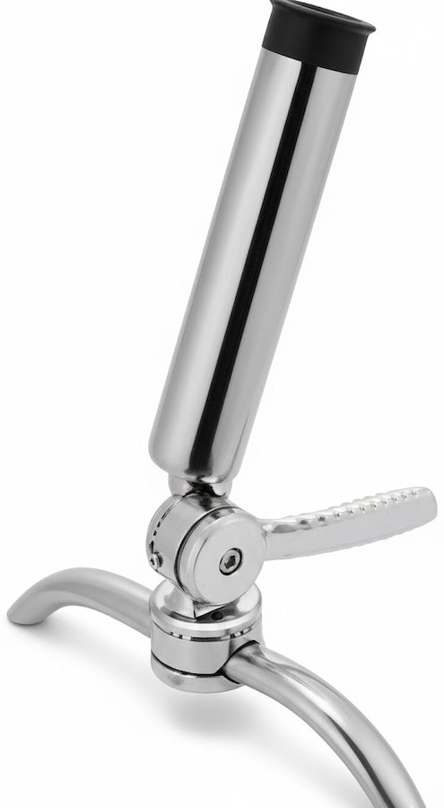 Portacanne orientabile realizzato in acciaio inox 316 fuso con finitura lucidata a specchio. Struttura robusta e meccanismo a doppio cricchetto per una regolazione precisa e sicura. Il sistema consente rotazione orizzontale completa a 360° e inclinazione verticale fino a 144°, garantendo il corretto posizionamento della canna in ogni situazione.