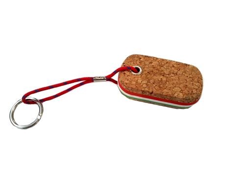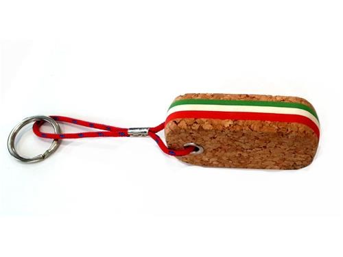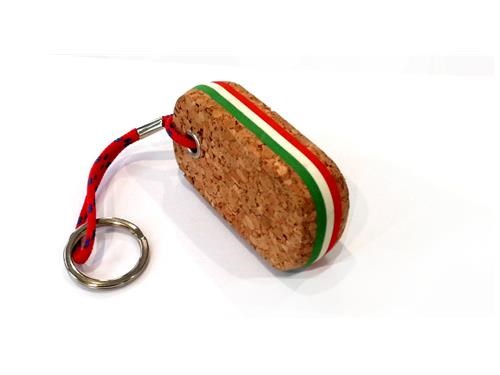 Portachiave galleggiante in sughero con colorazione ITALIA . Dimensioni : 80 x 45 x 22 mm. .