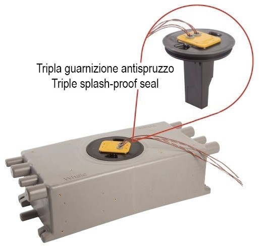 Pozzetto di raccolta acque grigie WHALE con sensore IC integrato. Il pozzetto ha sensori integrati per il controllo automatico della pompa e gestisce in modo affidabile i rifiuti tipici della doccia / della cucina fino a 90°C anche in complessi sistemi di scarico multipli. Il coperchio a tripla guarnizione antispruzzo, stampato in polipropilene-vetro, integra l'elettronica isolandola dal contatto con l’acqua. Nessuna parte mobile è incline a bloccarsi nel tempo. Il serbatoio ha base convessa per il massimo svuotamento e portagomma presagomati per la precisione nella perforazione. È possibile installare le pompe “Gulper” direttamente sul pozzetto seguendo la guida di installazione stampata sul serbatoio. I pozzetti si abbinano all’intera serie Gulper, pompe consigliate nello schema in calce. L’altezza del sensore rispetto alla porta di uscita è ottimizzata per eliminare il rumore di aspirazione tipico degli altri pozzetti sul mercato. Il modello da 20 litri offre il 25% in più di capacità con un doppio sensore che consente di installare una pompa aggiuntiva, che interviene in caso di grandi flussi in entrata, o di montare un allarme di alto livello.