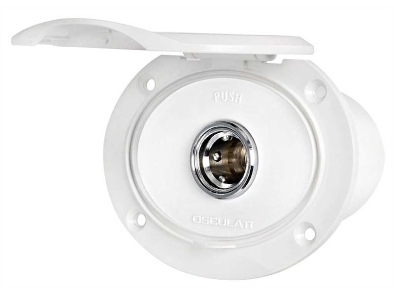 Si collega alla rete idrica di bordo (acqua dolce) o alla pompa Washdown (acqua salata) e mantiene in pressione la linea. Il tubo di lavaggio si innesta a scatto nella presa e fa automaticamente partire la pompa. Box in ASA resistente agli UV con inserto in acciaio inox AISI 316, meccanismo in ottone cromato.