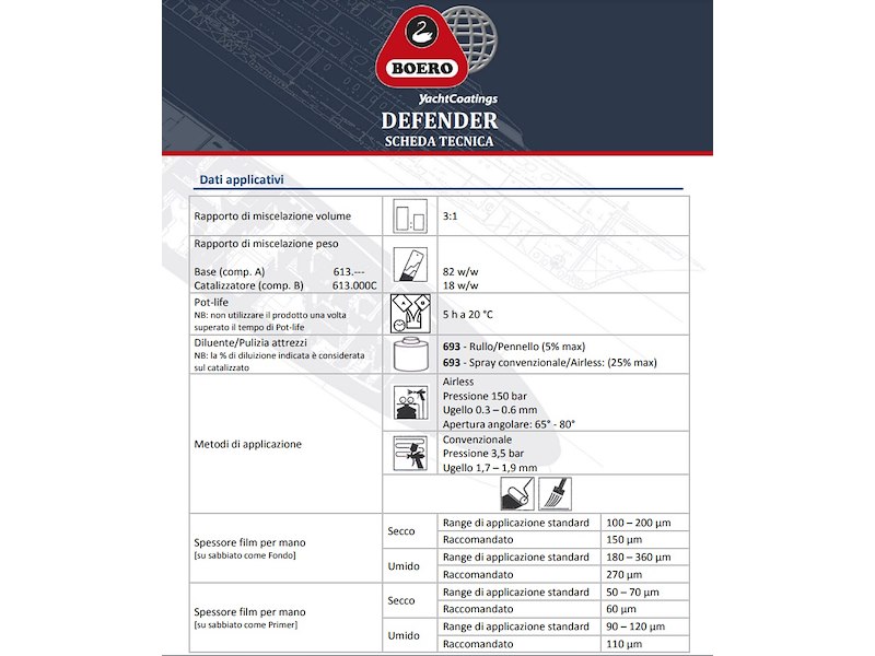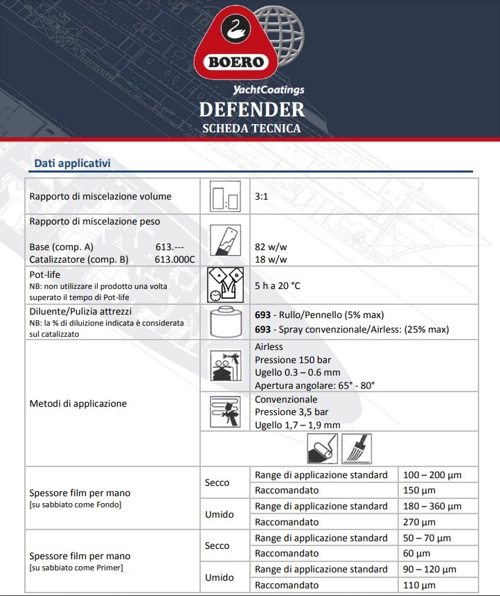 Primer epossidico bicomponente Boero Defender modificato utilizzabile su qualsiasi tipo di supporto. Questo prodotto può essere impiegato come primer o come fondo nei cicli di verniciatura. La sua peculiarità è quella di poter essere ricoperto a distanza di tempo con ogni tipo di antivegetativa Boero. Ideale per la carena ma anche per il fuoribordo e le sovrastrutture. Resa teorica 4 m²/lt. - Numero di mani 2/4 - Ricopribile min. 3 h - Carteggiatura 24 h - Rapporto di catalisi in volume 3:1 .