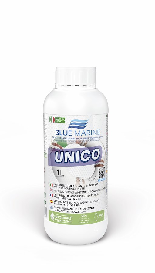 Blue Marine Unico è un prodotto in polvere per una profonda pulizia di barche in vetroresina; ottimo anche per la pulizia e lo sbiancamento del teak. Rimuove con eccezionale forza qualisiasi tipo di sporco, ingiallimenti, linee di galleggiamento, striature nere, lasciando le superfici candide e lucenti. Non corrode nessun tipo di superficie, metalli compresi; non graffia, non decolora e non macchia. Elimina macchie di ruggine da qualsiasi superficie. Lucida e protegge passamani, candelieri e qualsiasi tipo di metallo. Come si usa: bagnare le superfici da trattare e cospargele successivamente di " Unico " ; attendere qualche minuto dopodichè, utilizzando uno spazzolone morbido prevalentemente bagnato, spazzolare nei due sensi, verticale ed orizzontale, tutta la superficie da trattare. Infine risciacquare abbontamente con acqua. Assicurarsi che la superficie da trattare sia sempre bagnata durante l'utilizzo del prodotto. Il risultato sarà un'imbarcazione candida e lucente come nuova, compresi metalli e teak con tempi di lavorazione brevissimi.