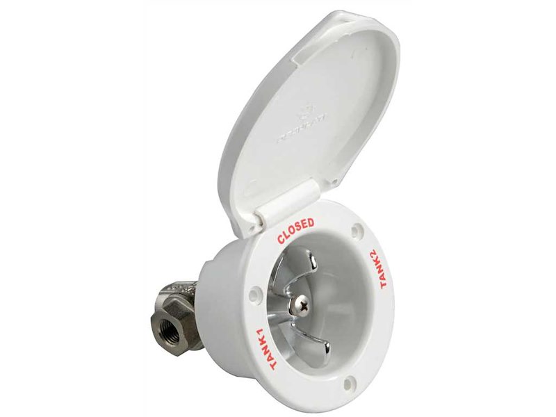 Rubinetto a 3 vie con contenitore per collegare due serbatoi ad un motore. Tre posizioni tank 1 / tank 2 / chiuso.