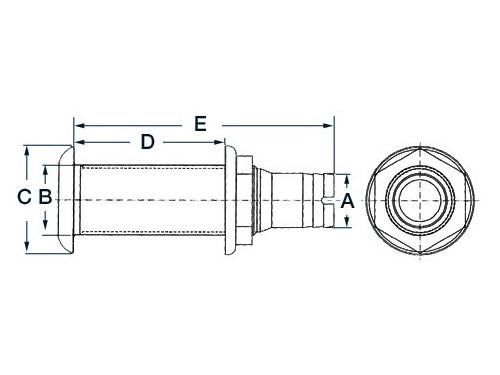 Dimensioni : A Ø 38 mm. - Filetto 2" 1/4 - B Ø 57 mm. - C 73 mm. - D 95 mm. - E 166 mm. .