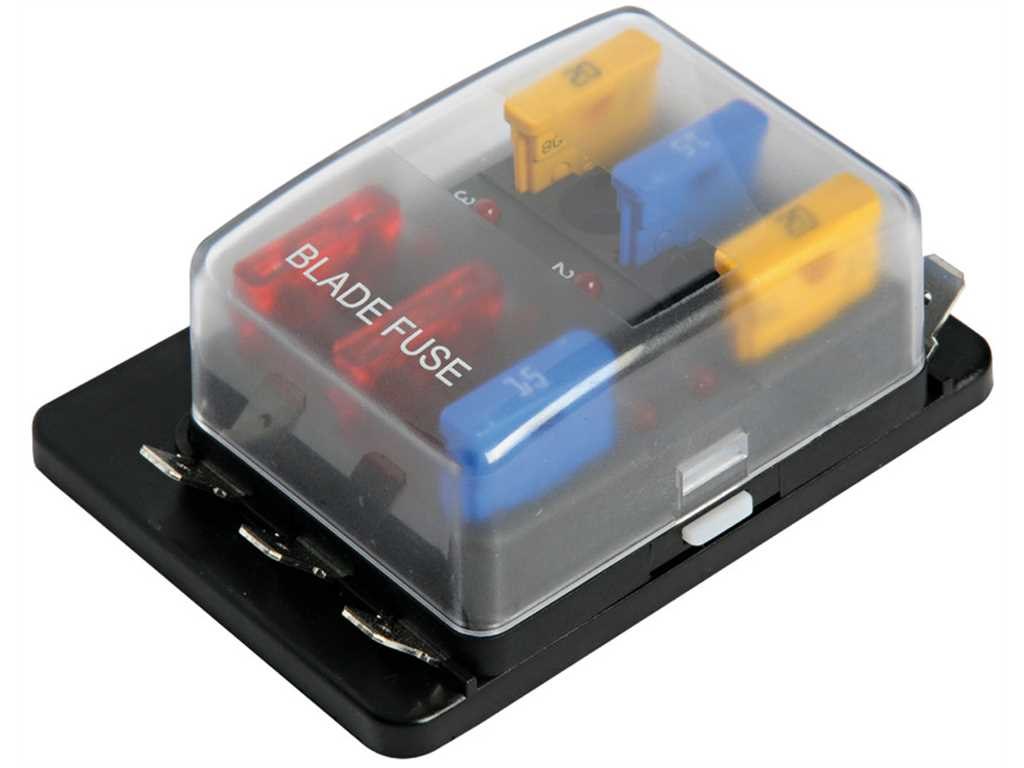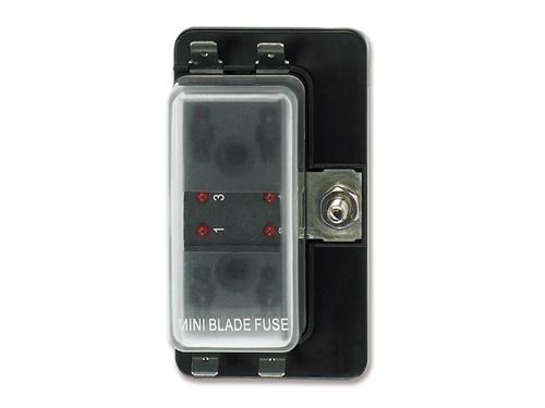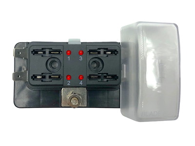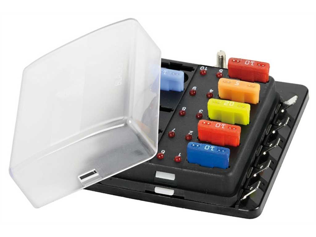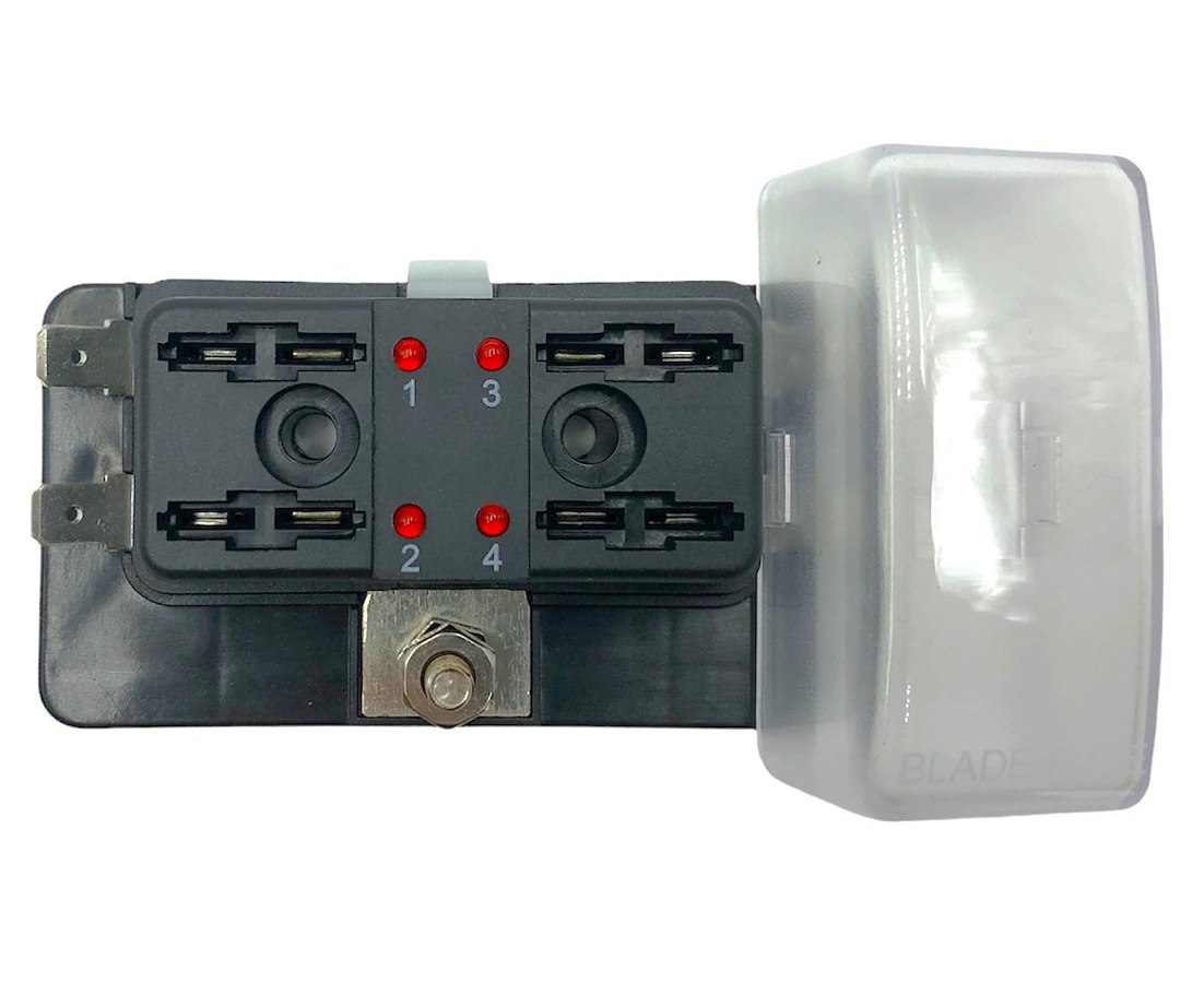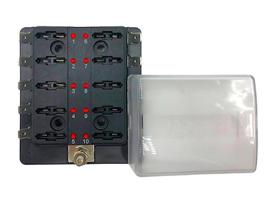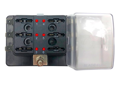 Scatola portafusibili lamellari con positivo in comune. Coperchio trasparente e indicatore a Led che si attiva quando il fusibile è rotto. Carico massimo 100 A.
