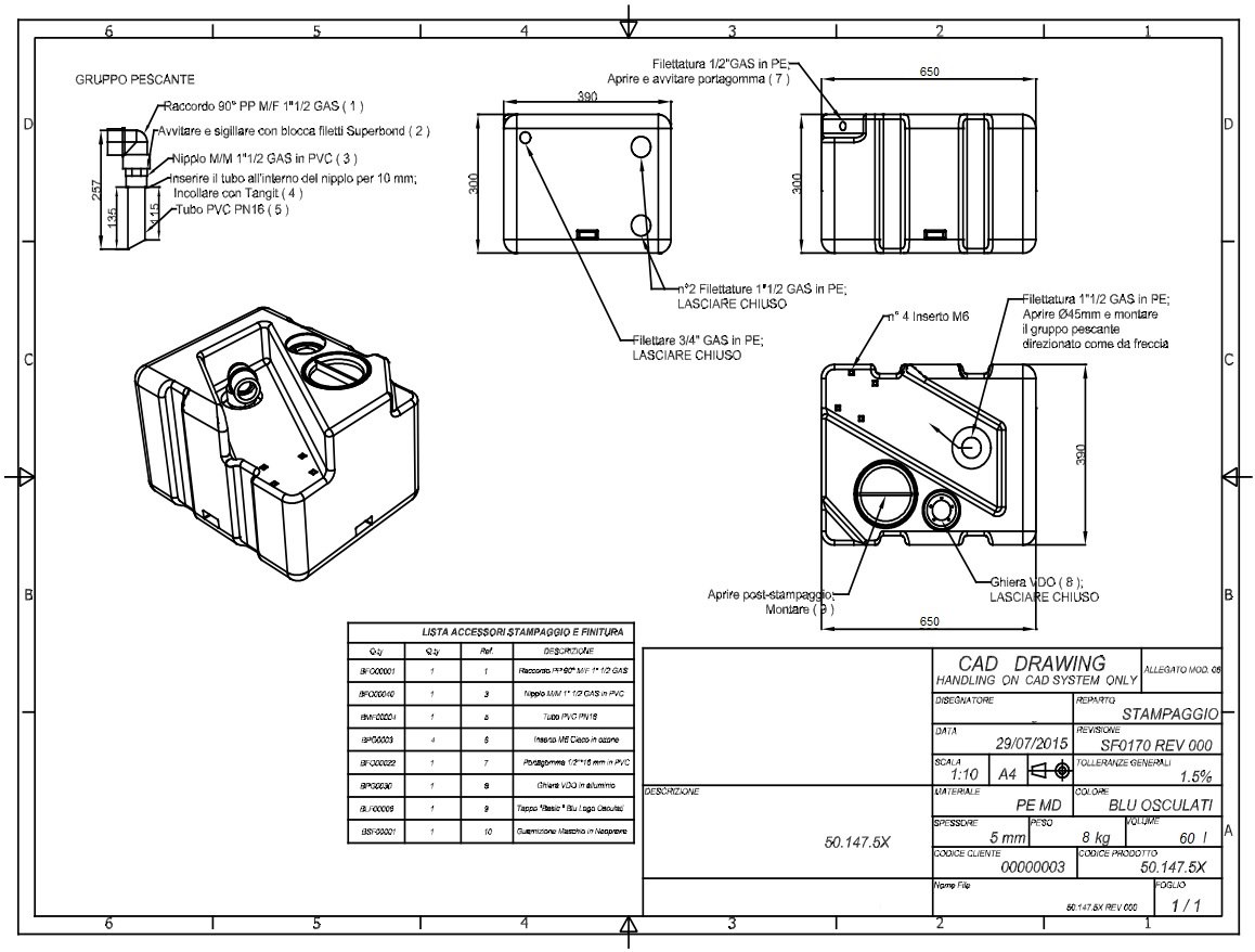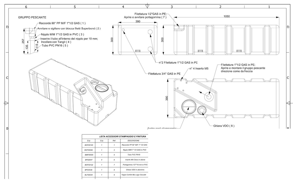 Serbatoi acque nere per barca con maceratore incorporato a norma ISO 8099. Forniti già montati e pronti all'installazione. Compatibile con tutti i WC elettrici e manuali. Il maceratore elettrico a 12 V ha una portata di 43 Lt/min con prevalenza 3 mt, è autoadescante da 0,60 mt, consuma 12 A/h. Bocchettone uscita Ø 25 mm. Serbatoio con raccordo femmina di carico D.1-1/2" + D.3/4" e raccordo femmina sfiato D.3/4". Raccordo femmina di scarico emergenza manuale D.1-1/2". Provvisto di incavi per ganci di fissaggio e di valvola di intercettazione per poter staccare il maceratore in caso di manutenzione. Flangia 5 fori per-forata per sensore di livello (sensore non incluso).