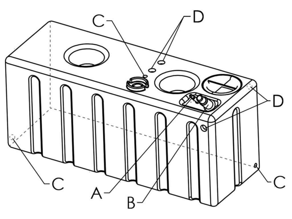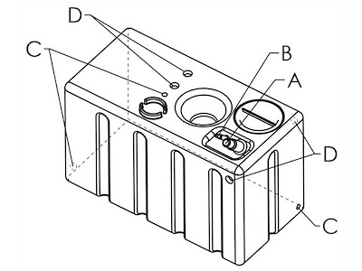 Serabaoi per acqua potabile in polietilene alimentare lineare. Completo di tappo di ispezione + predisposizioni multiple per carico, scarico, sfiato con filetti femmina da 1" 1/4, 3/4", 1". Predisposto per installazione indicatore di livello con flangia universale internazionale 5 fori.
