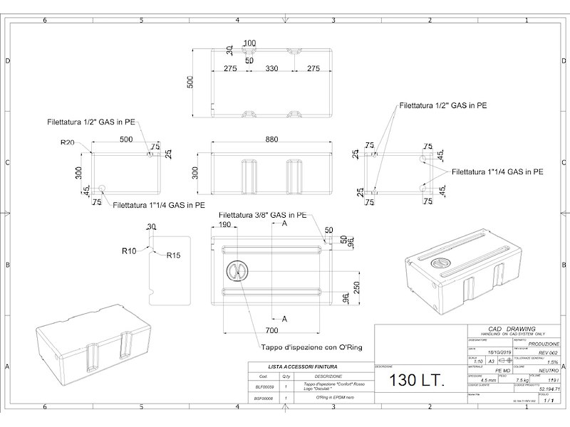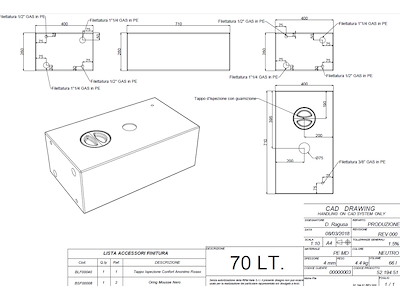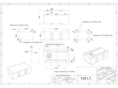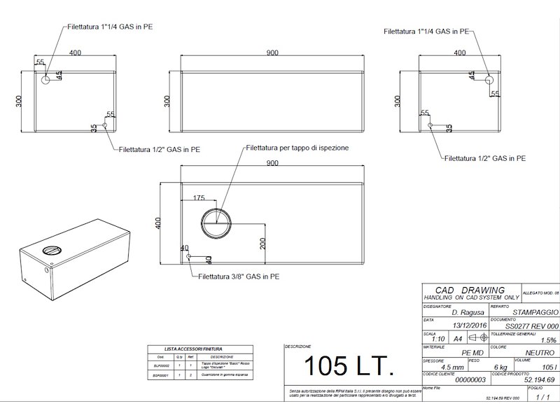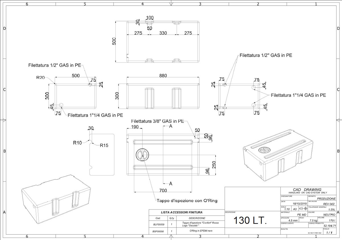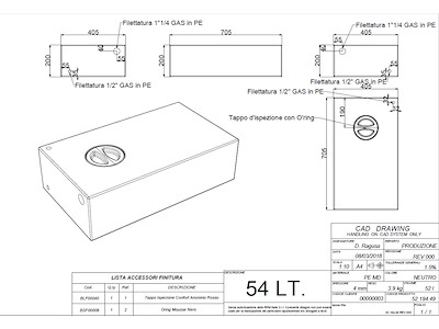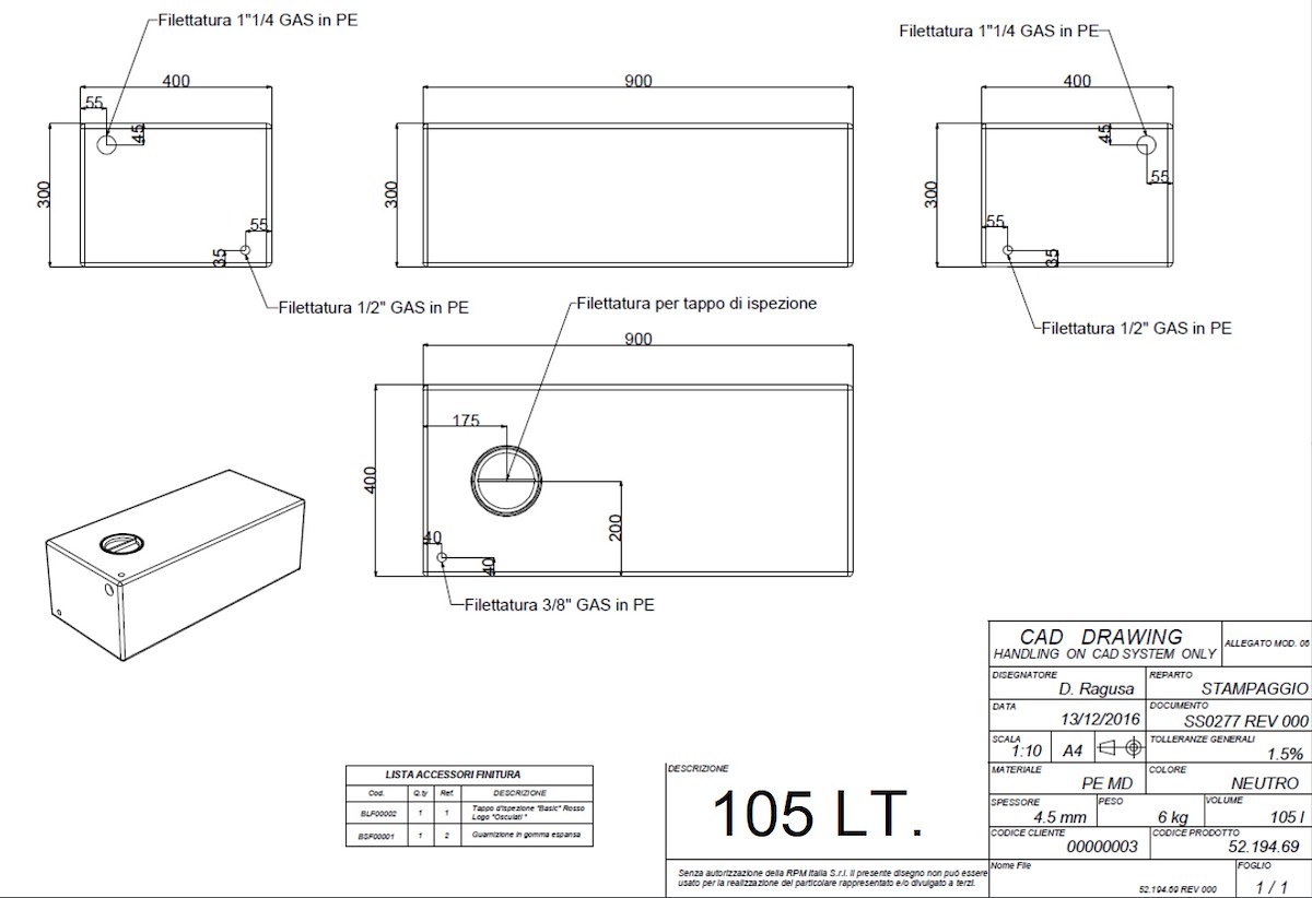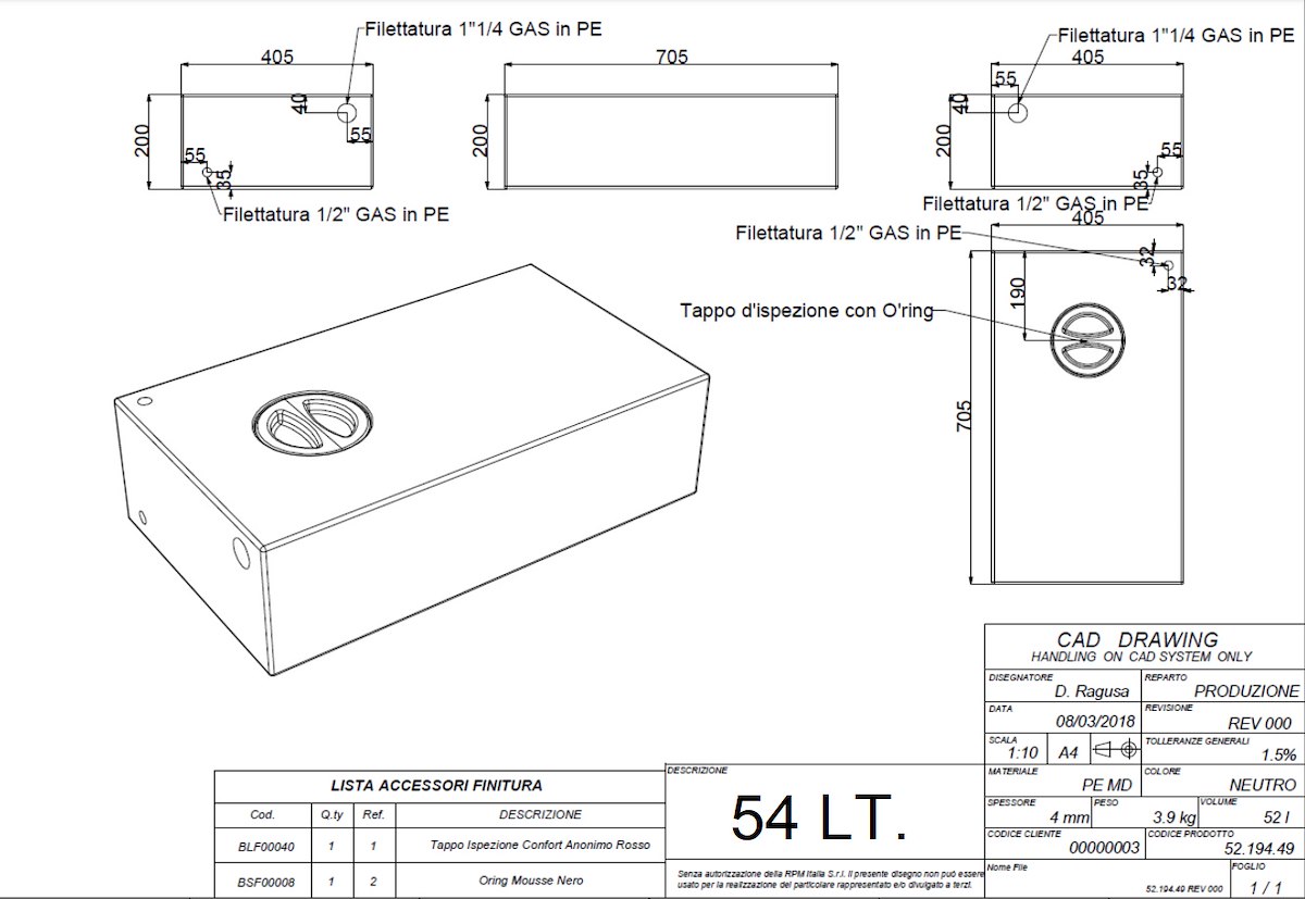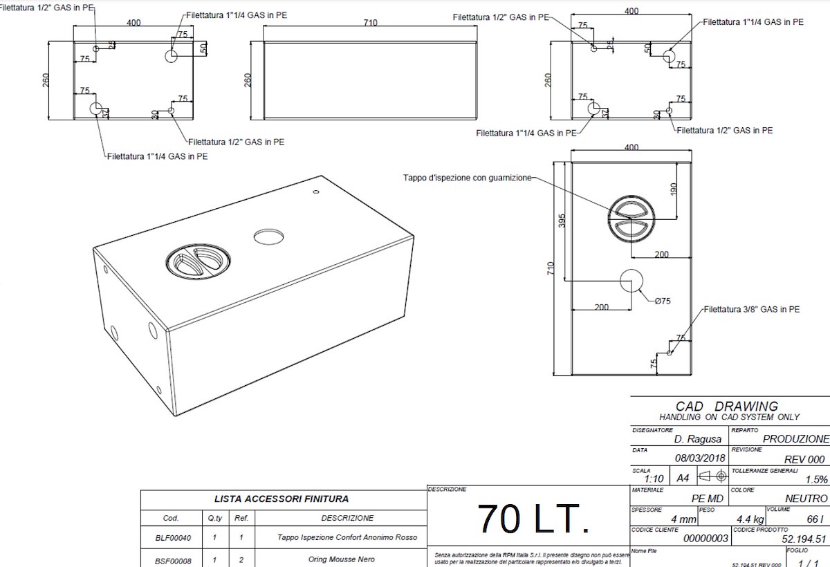 Serbatoio nautico rigido per acqua modello Olympia, con tappo di ispezione e fori ciechi già filettati per raccordi ( raccordi non forniti ). Fori posizionati su tutte e due i lati corti e sulla parte superiore. Costruito in materiale atossico.