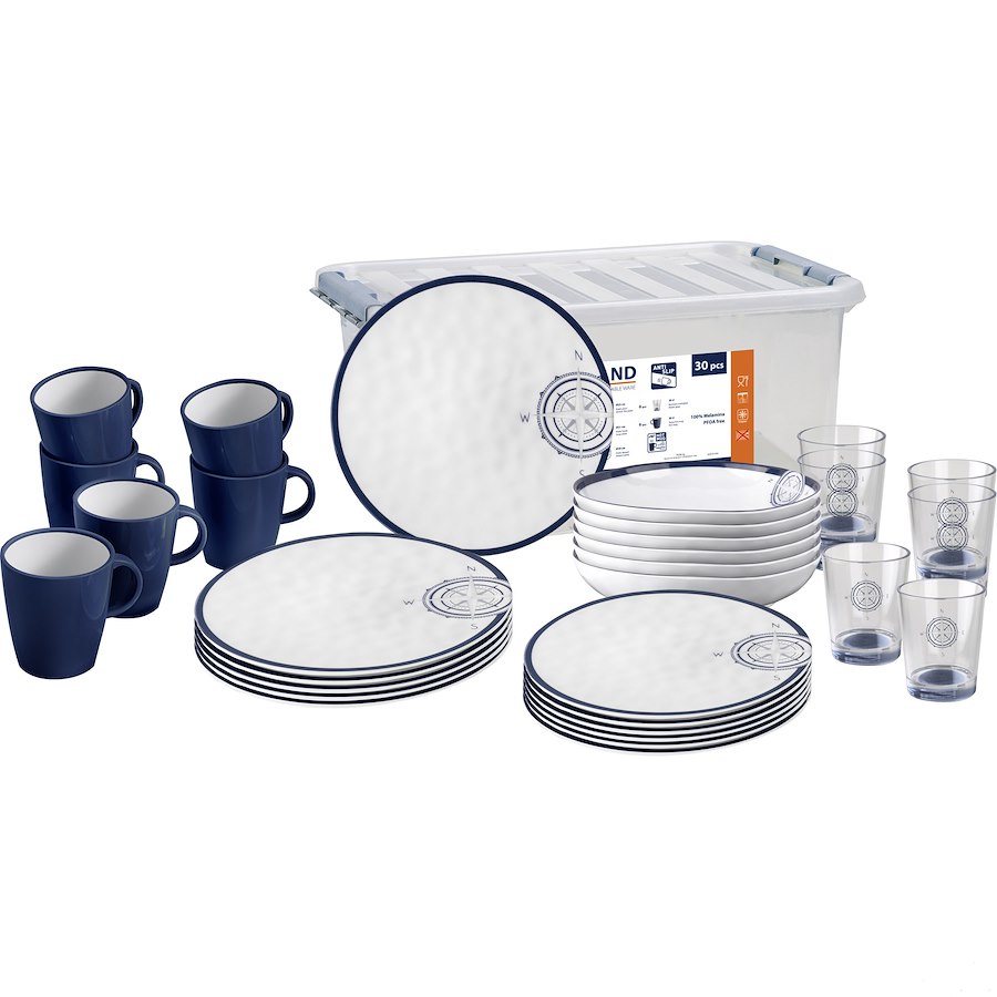 Il kit comprende: 6 piatti piani - 6 piatti fondi - 6 piatti dessert - 6 bicchieri 30 cl. - 6 tazze.