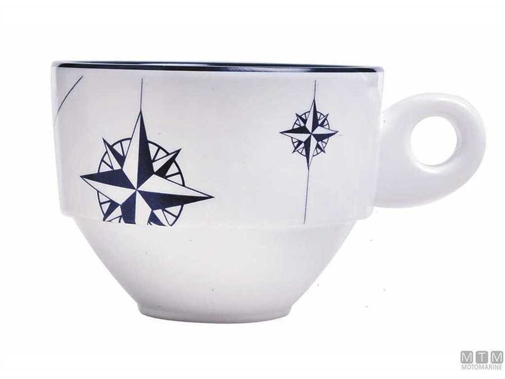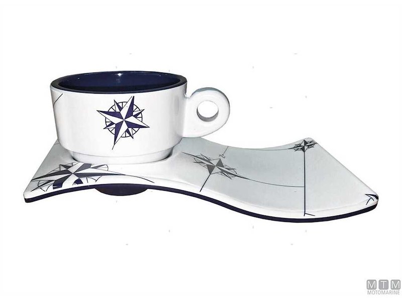 Set infrangibile caffé NORTHWIND, realizzato in melamina, composto da tazza e piatto di colore bianco con il disegno della rosa dei venti nel colore blu marino. I suoi piatti sono anti caduta, visto che sono incavati in modo che la tazza rimanga stabilminte fissata al suo interno.
