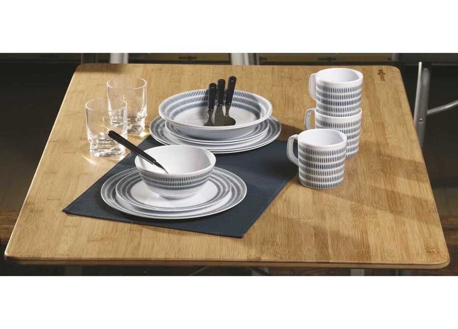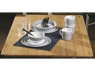 Composto da: 4 piatti piani ø 25 cm + 4 piatti fondi ø 22 cm + 4 piattini da dessert ø 20 cm + 4 tazzine con manico da 35 cl.