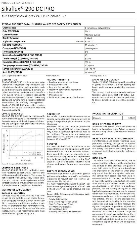Sikaflex 290 DC è un adesivo poliuretano elastico monocomponente. Ideale per sigillature esterne essendo UV resistente. Particolarmente indicato per sigillature esterne di oblò o finestrature. Carteggiabile, non fa ricciolo come il silicone. Ottimo anche come collante legno, legnovetroresina, metalli, ecc. Resa 6 x 6 mm. - 8,9 mt. ogni cartuccia.