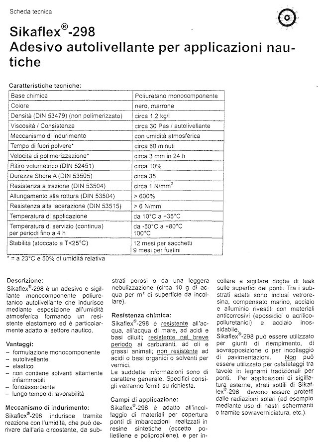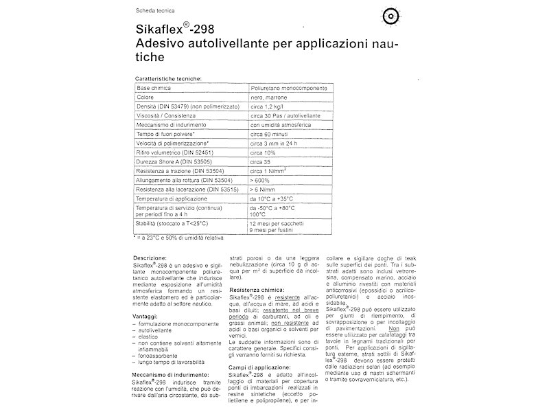 Impieghi: incollaggio coperte in teak, compensato marino, viroko su VTR, acciaio, legno. Incollaggio pavimentazioni interne (legno, marmo, laminato). Necessita circa 1 kg per ogni m2 per spessori di adesivo di 3 mm.
