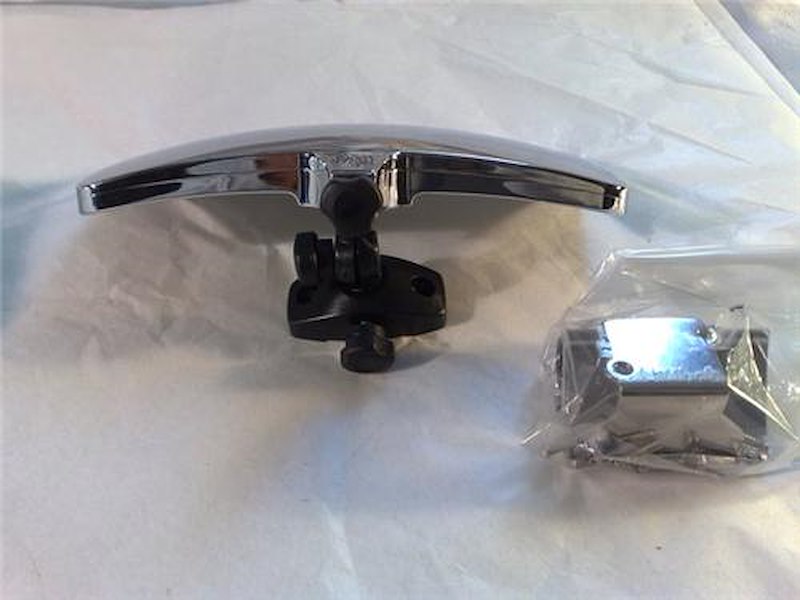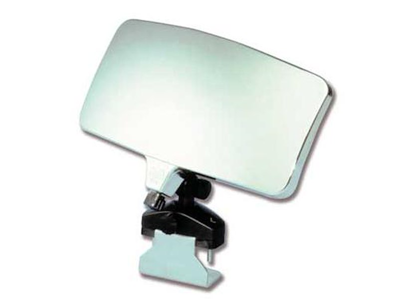 Specchio retrovisore convesso per sci nautico. Fissaggio universale sul cruscotto sul parabrezza dell'imbarcazione. Fabbricato in ABS cromato e completo di attacco snodato e regolabile in tutte le posizioni. Specchio di forma bombata che permette una visibilità di 180°. Fornito completo di viti inox per il fissaggio. Dimensioni 200 x 95 mm. Peso gr. 265.