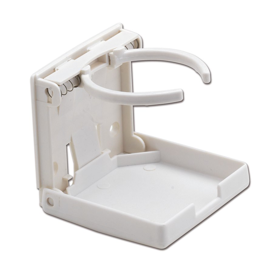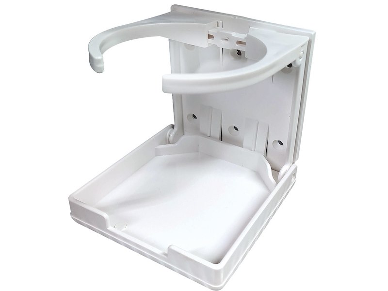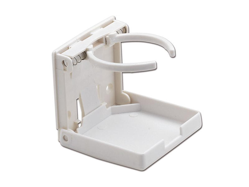 Supporto porta bicchieri a ribalta . Fabbricato in plastica. Una volta chiuso occupa pochissimo spazio. Dimensioni 100 x 95 mm. .