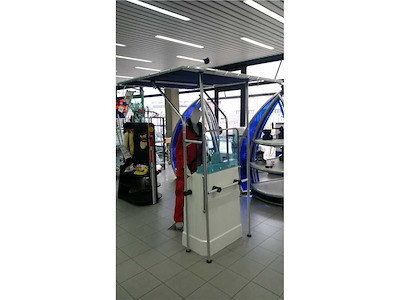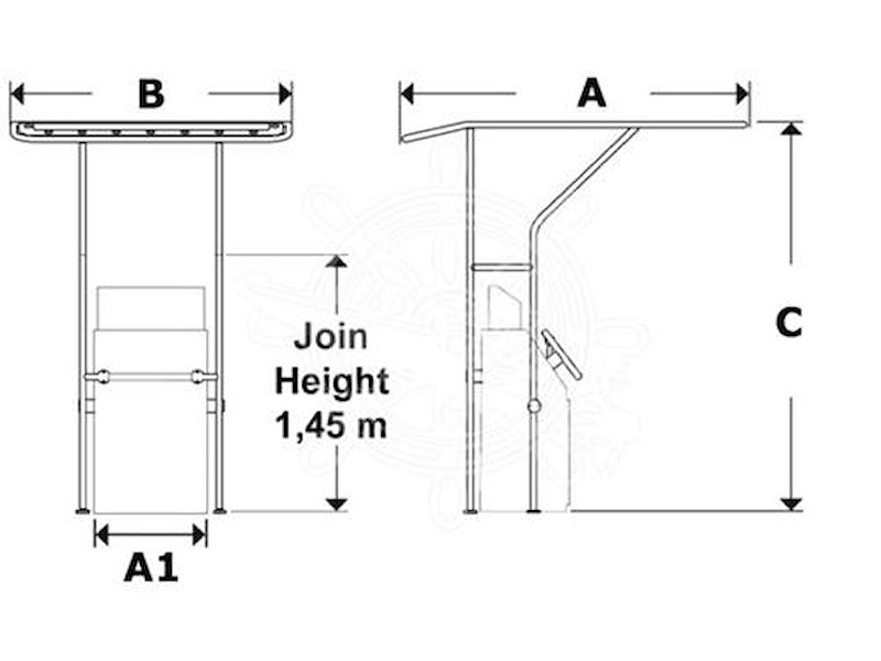 T-Top per barca fabbricato in tubo anodizzato Ø 32 mm. Universale per ogni tipo di console, in quanto gli attacchi possono essere regolati a piacere. Il tessuto del "Top" è in poliestere ATLAS blu da 310 gr/m2 impermeabile ed UV resistente e può essere tolto per la manutenzione. Tutti i componenti sono inossidabili. Velocità massima consentita con telo installato: 25 nodi.