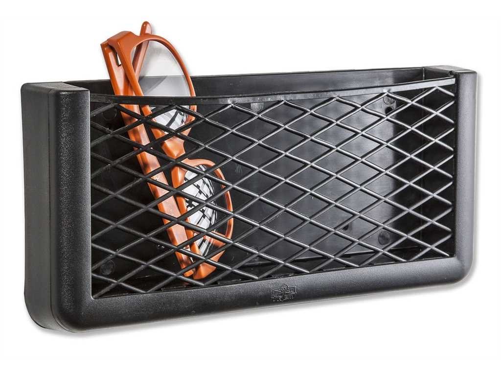 Pratica tasca portaoggetti con retina in gomma. Fissaggio sia con biadesivo che con viti autofilettanti.