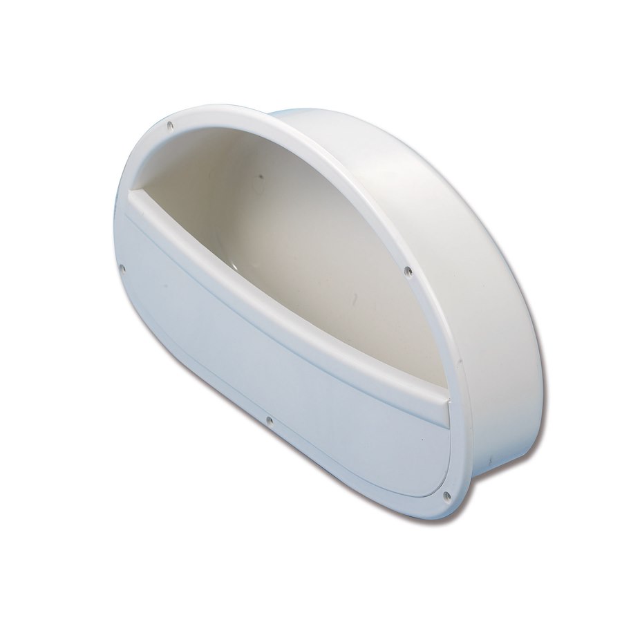 Tasca laterale portaoggetti per barca. Fabbricata in ABS bianco, provvista di pannello salvacadute.