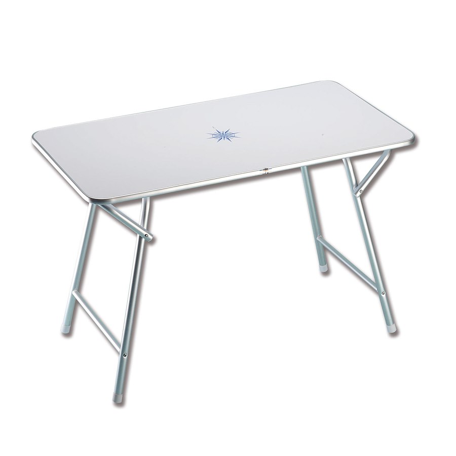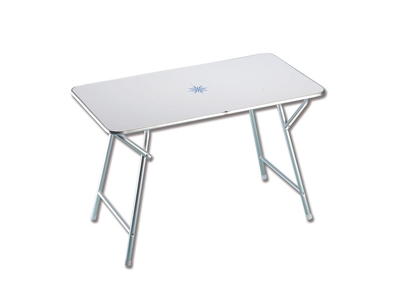 Tavolo pieghevole con decoro marino. Realizzato con piano in laminato bianco con decoro marino e struttura in alluminio anodizzato. Piedi pieghevoli per riporlo.