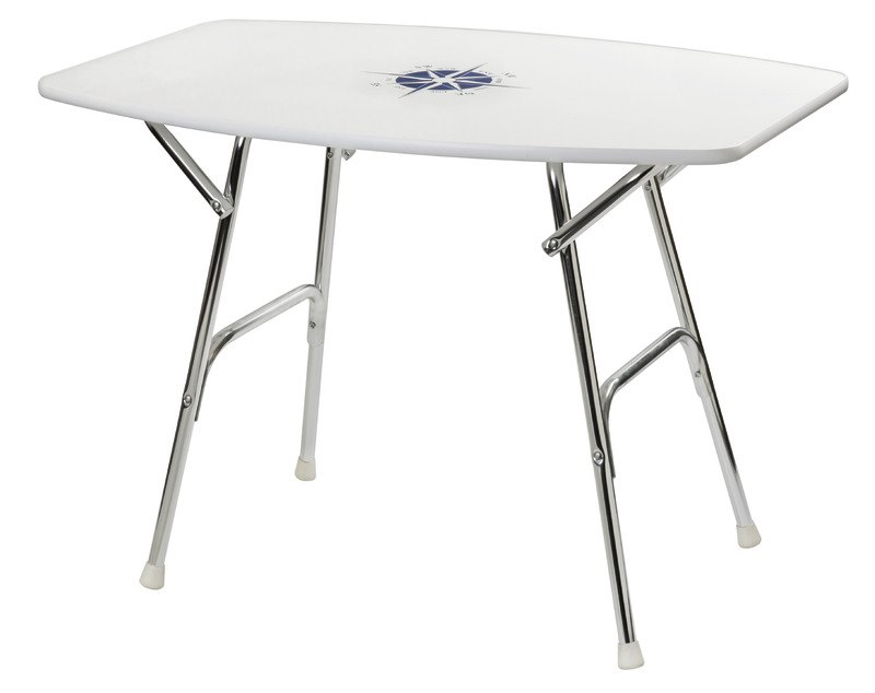 Tavolo pieghevole ovale con decoro marino. Realizzato con piano in laminato bianco con decoro marino e struttura in alluminio anodizzato. Piedi pieghevoli per riporlo.