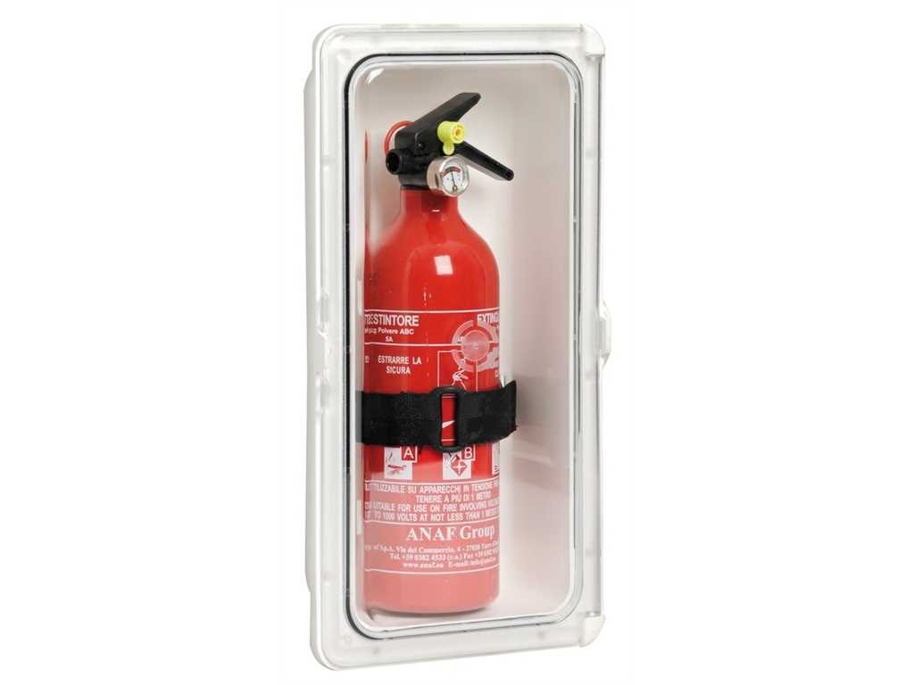 In polipropilene bianco con portello in policarbonato resistente UV trasparente e chiusura a scatto. Tenuta stagna, aspetto molto gradevole con finitura perfetta, colore bianco. Fornito con appositi supporti e nastro autobloccante apribile per un ottimo fissaggio dell’estintore.