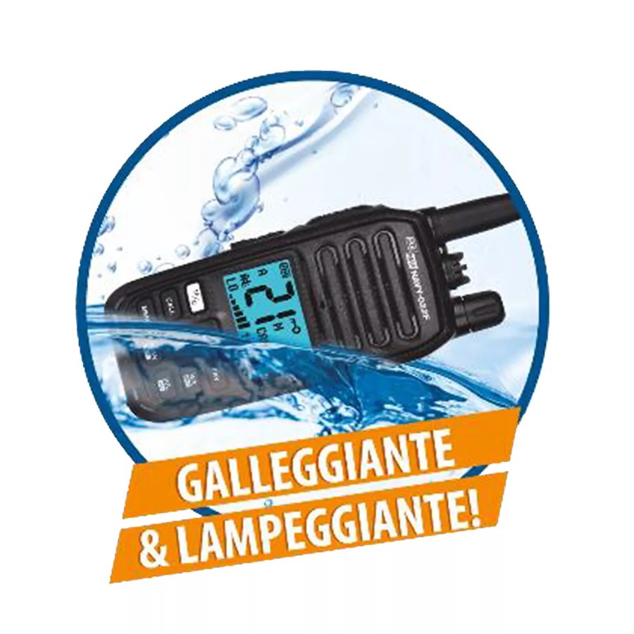 Ultimo nato della famiglia Polmar il vhf Navy 022. Si tratta di un vhf perfettamente galleggiante in caso di caduta accidentale in acqua e dotato di funzione di drenaggio dell’acqua depositata sulla membrana dell’altoparlante tramite vibrazione.  Ha 3 livelli di potenza a scelta tra 5,5 , 2,5 o 0,7 Watt. Facilità di individuazione tramite i due led posti sul fronte del vhf. Impugnatura pratica ed ergonomica. Il display LCD è retroilluminato con la possibilità di scelta tra 7 diversi colori. Funzione NCR per la cancellazione attiva del rumore. Accesso diretto Canale 16 e memorizzazione canali. Dual-Tri Watch, blocco tastiera, visualizzazione intensità del segnale in trasmissione e ricezione, Indicatore stato della batteria. Completo di pacco batteria da 7,4V-1800 mAh agli Ioni di Litio, caricabatteria da tavolo e clip da cintura. Funzione di risparmio energetico. Caratteristiche tecniche: Frequenza 156.000-162.175 MHz. Temperatura di funzionamento: -10°C +50°C. Sensibilità 12dB. Dimensioni mm 62 x 41 x 146 (280) con antenna.