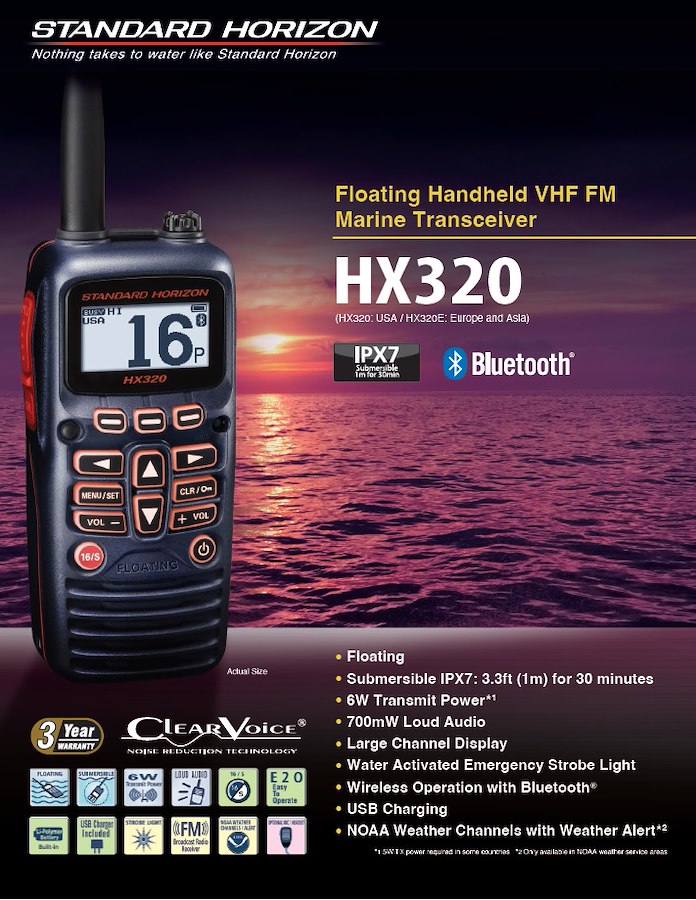 Ultimo nato della famiglia è il nuovissimo VHF Standard Horizion portatile HX320E. Impermeabile e galleggiante e dotato di bluetooth. Grazie all'ampio display e ad un interfaccia molto semplice, l'utilizzo in mare anche in situazioni complicate sarà semplicissimo. La caratteristica che contraddistingue questo nuovo apparecchio è l'integrazione del modulo Bluetooth, collegando il vhf alle cuffie è possibile ricevere e trasmettere a mani libere. Questo è particolarmente utile in caso di dover governare e comunicare allo stesso tempo.
