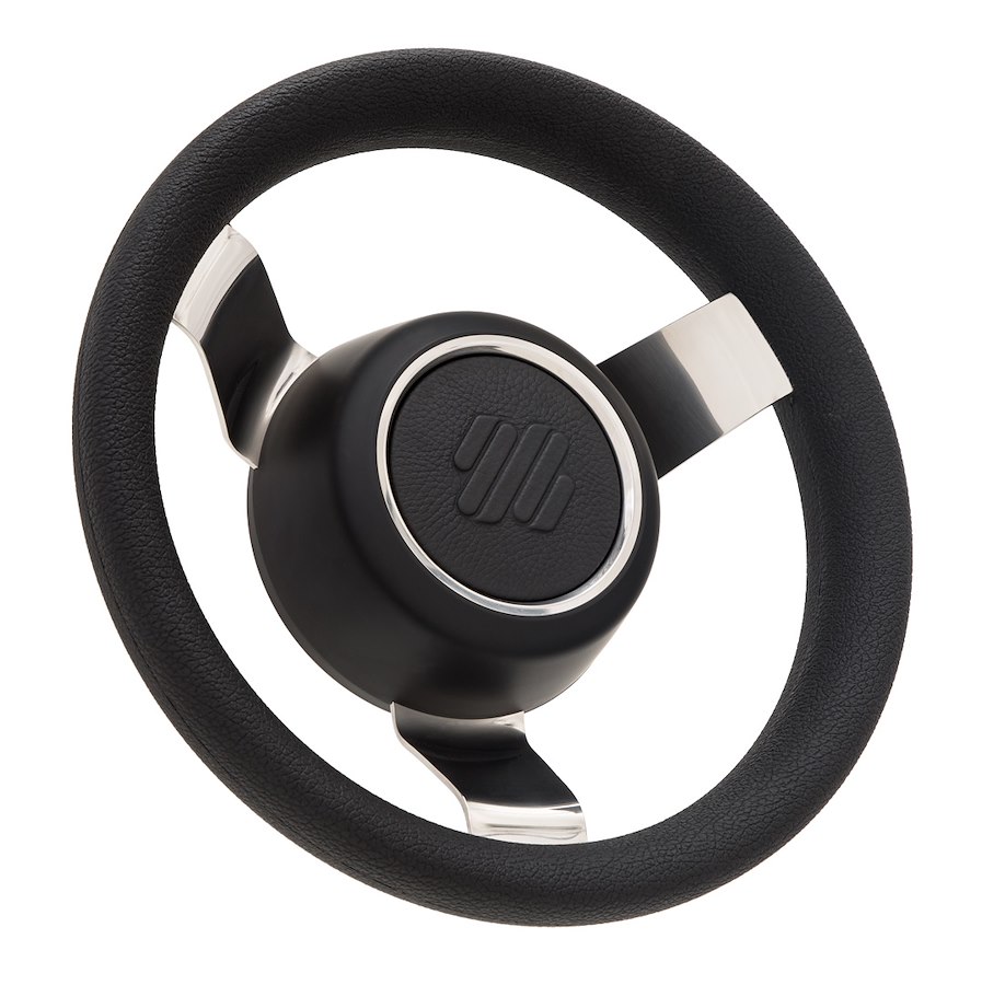 Volante barca a 3 razze in acciaio inox 304, lucide. Diametro esterno 350 mm. Cono standard da 3/4".