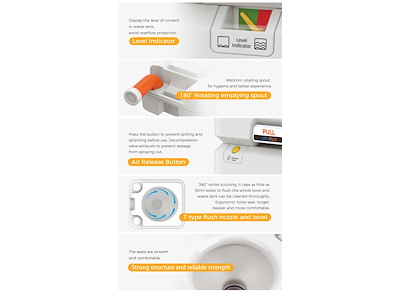 1. Sistema di Scarico a Vortice T-Type Flush ( gli Standard spesso hanno un unico getto d'acqua laterale che lascia zone sporche nella tazza). SEAFLO Premium: Utilizza un ugello a "T" con uscita a 360°. L'acqua crea un vortice che sciacqua l'intera superficie della tazza con soli 50 ml, garantendo massima igiene e risparmio idrico, fino a 100 scarichi con un pieno.